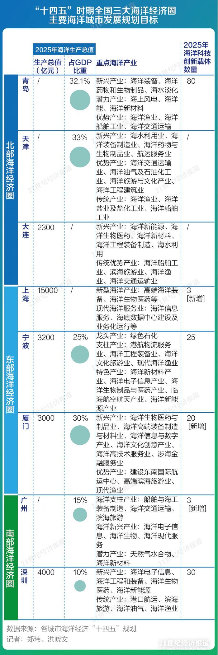8月24日,广州正式发布《广州市海洋经济发展“十四五”规划》。至此,北部海洋经济圈的青岛、天津、大连,东部海洋经济圈的上海、厦门、宁波,以及南部海洋经济圈的广州、深圳等核心海洋城市均已明确海洋经济“十四五”路线图。同时,这些城市也相继提出建设全球海洋中心城市的目标。