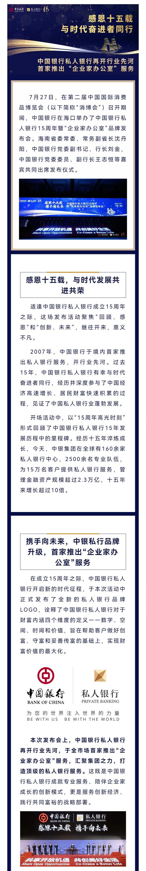 7月27日,在第二届中国国际消费品博览会(以下简称“消博会”)召开期间,中国银行在海口举办了中国银行私人银行15周年暨“企业家办公室”品牌发布会。