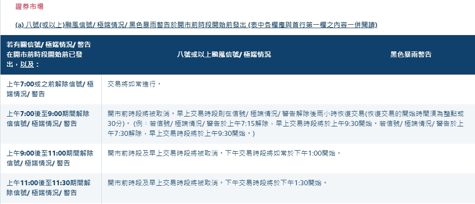 如香港天文台按预期的在9至11时之间改发三号强风信号,则港股开市前时段及早上交易时段将被取消。下午交易时段将如常于下午1:00开始。