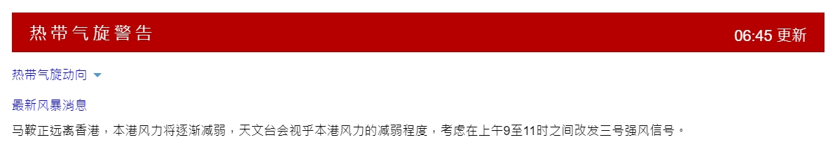 据香港天文台发布的最新风暴信息,截止发稿仍维持八号东北烈风或暴风信号。香港天文台同时表示,台风“马鞍”正远离香港,风力将逐渐减弱,天文台会视乎风力的减弱程度,考虑在上午9至11时之间改发三号强风信号。