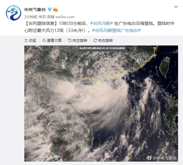 中央气象台消息,10时30分前后,台风“马鞍”在广东电白沿海登陆。登陆时中心附近最大风力12级(33米/秒),中心最低气压975百帕,强度为台风级。
