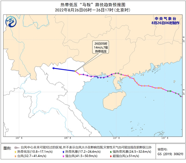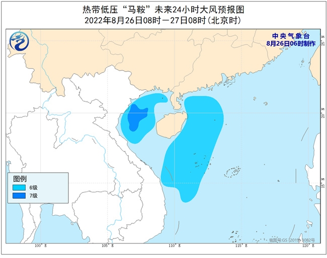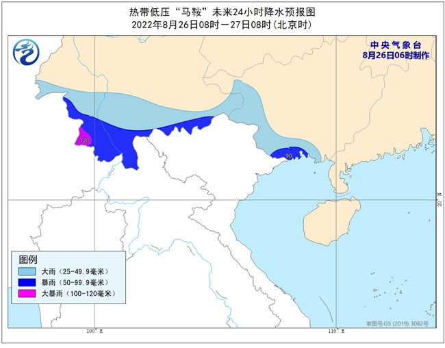 预计26日08时到27日08时,北部湾、南海西部、西沙群岛附近海域、海南岛东部沿海仍将有6-7级大风,阵风可达8级。广西南部和西部、云南南部将有大到暴雨,其中云南西南部的部分地区有大暴雨(100-120毫米)。