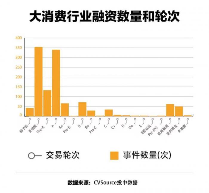 从投资阶段看,统计期间内,以早期阶段的消费融资项目为主。其中,天使轮融资事件最多,共计354起,其次为A轮和Pre-Al轮,分别为340起和133起,三项总计占全部融资事件的68%以上。这与硬科技投资类似,后期项目投资估值较高,而机构更希望从早期项目中发现机会,但同时也无形中增加了投资风险。