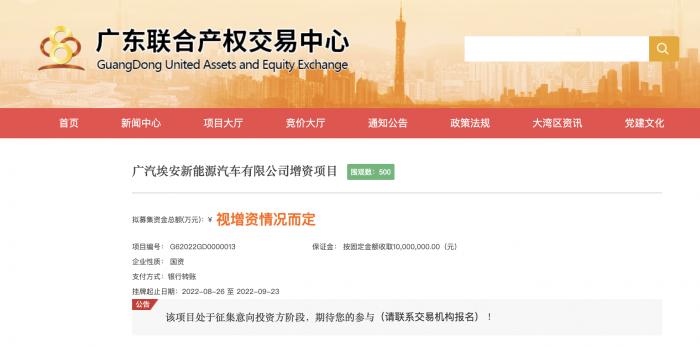 8月26日,广东联合产权交易中心官网显示,广汽埃安A轮引战增资项目正式挂牌,挂牌起止日期为8月26日至9月23日。