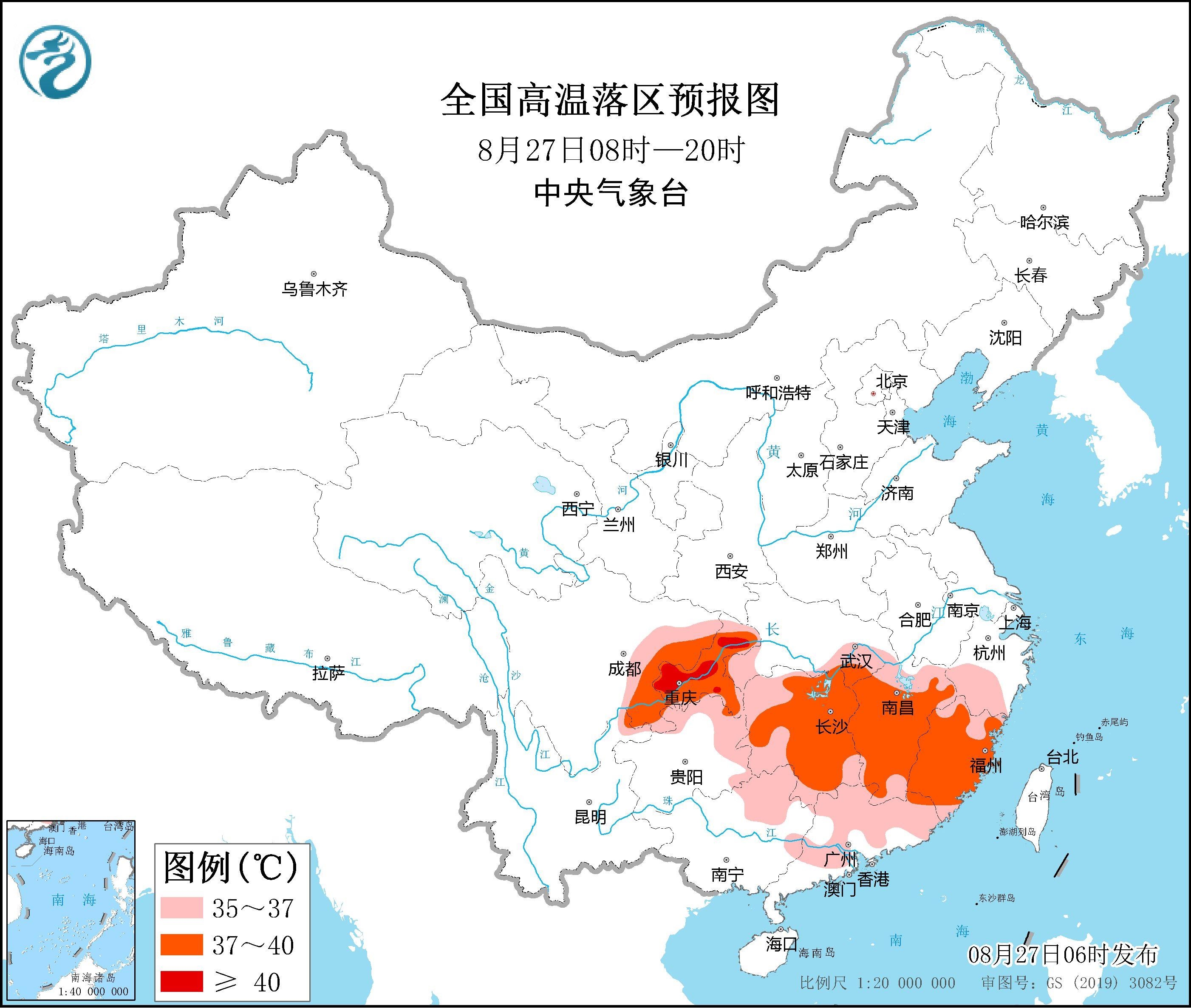 中央气象台8月27日6时继续发布高温黄色预警:预计8月27日白天,四川东部、重庆、贵州北部和东部、湖北南部、湖南、江西、浙江南部、福建、广东中北部、广西北部等地有35~39℃高温天气。其中,重庆西部和北部的部分地区最高气温可达40℃以上。