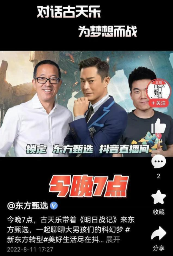 比如,电影《新神榜:杨戬》的导演赵霁做客东方甄选,与俞敏洪等人聊起了电影创作的相关知识;电影《明日战记》主演古天乐也在8月11日来到直播间,畅聊电影背后的猛料,直播间实时在线人数最高达到70W。