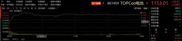 受消息面影响,截至8月29日A股收盘,东方财富Choice数据显示,TOPCon电池指数(861459.EI)涨2.99%,成分股中,北京科锐、晶科能源领涨。