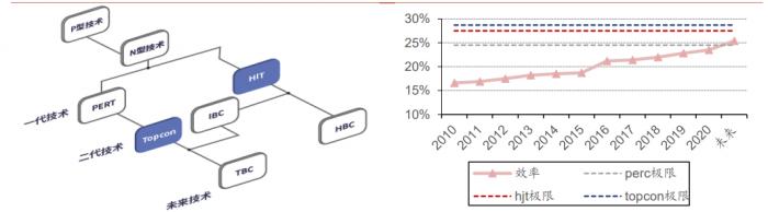 光伏电池技术迭代路线图、电池效率趋势图/图片来源:招商证券