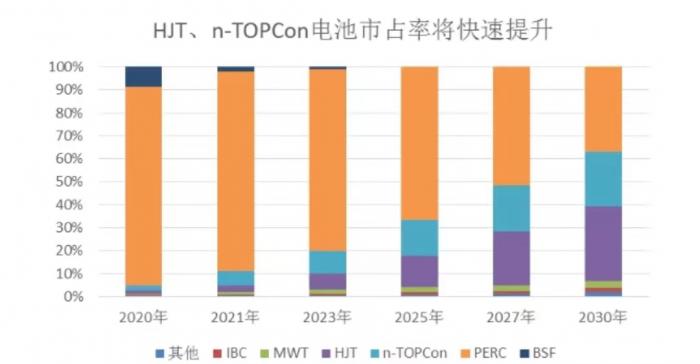 光大证券指出,根据中国光伏协会的预测,随着HJT、TOPCon技术的进步,2030年光伏电池格局将发生重大变化。PERC晶硅电池市占率将由2021年的87%锐降至36.7%,HJT单晶硅电池、n-TOPCon单晶硅电池市占率将分别达到32.5%、24.1%。