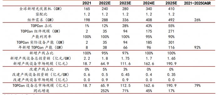 按照国内外电池厂商投资规划,预计2022年开始,TOPCon有望进入产能爆发期,TOPCon产能主要来自于新增投产和PERC产线改造,随着设备国产化、材料与工艺成熟度提升,预计2025年TOPCon设备投资超240亿元,四年合计投资超700亿元。
