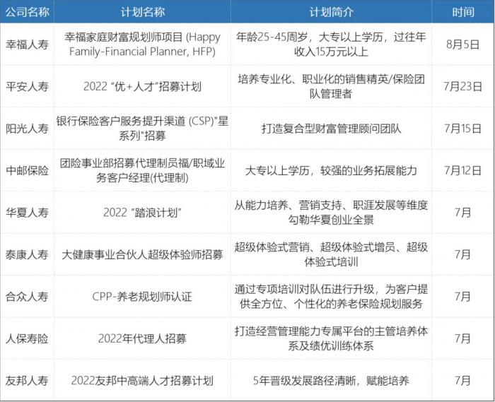 此外,据不完全统计,7月以来,以平安人寿、人保寿险为代表的近9家人寿险企都进一步加大了对高端代理人队伍的培育力度,并出台新一轮代理人优增培育规划。