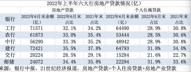 由于部分银行未披露剔除境外分行的数据,因此统一以全行数据测算。相应地,测算结果和实际情况可能有出入,但大致可以管窥相关情况。从走势看,今年上半年六大行房地产贷款占比均出现下降,其中农行降幅最大,其占比由去年末的35.4%下降至6月末的33%。