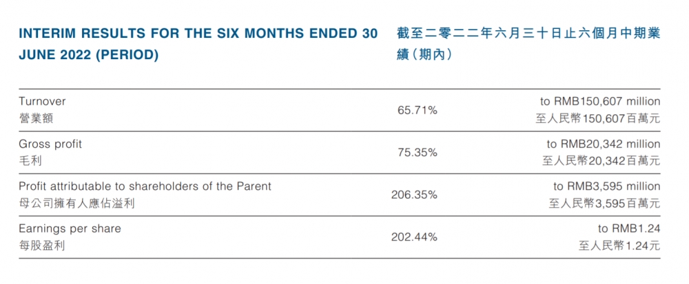 2022年8月29日晚间,比亚迪公布2022年上半年业绩报告,据H股公告报告显示,比亚迪在2022年上半年实现营收1506.07亿元(人民币,下同),同比增长65.71%;毛利203.41亿,同比增长75.35%;归母净利润35.95亿,同比增长206.35%;扣非后归母净利润30.29亿元,同比增长721.72%%;每股盈利1.24元,同比增长202.44%;经营活动现金流净额431.85亿,同比增长346.27%。