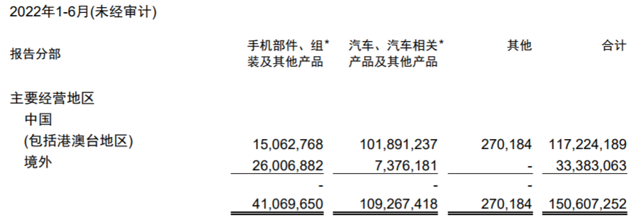合并后的汽车业务包括制造和销售汽车、汽车相关的模具及零部件、汽车租赁和汽车的售后服务、汽车动力电池、锂离子电池、光伏产品以及铁电池产品、轨道交通及其相关业务及防疫物资产品收入。2022年上半年,汽车业务的营收占比迅速攀升,从去年同期的52%,升至73%,手机部件、组装等业务占比剧烈下滑,从48%下滑至27%。