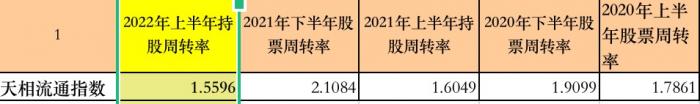 值得一提的是,天相数据显示,天相流通指数(天相流通指数以两个交易所所有A 股上市公司为样本,以流通股加权,是一个反映整体证券市场走势的综合指数)2022年上半年持股周转率为1.56倍,相对2020年、2021年的相关持股周转率都有所下降,说明市场总体交易热度有所下降。