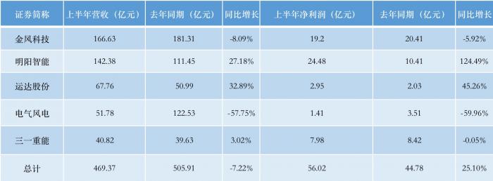 纵观已上市5家风电整机企业上半年财报,明阳智能业绩表现及增速堪称行业最优。金风科技、电气风电、三一重能净利润均同比下滑,运达股份上半年实现归母净利润2.95亿元,同比增长45.26%,增速不及明阳智能。