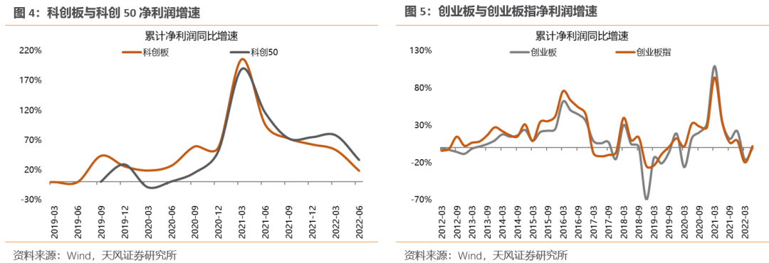 (3)科创板:大全能源对科创板业绩影响过大,22Q2科创板净利润累计同比18.9%;剔除大全能源后净利润累计同比为3.5%,较22Q1下降28.1个百分点;科创50指数净利润累计同比36.6%;剔除大全能源后仅为6.9%,较22Q1下降23.3个百分点。