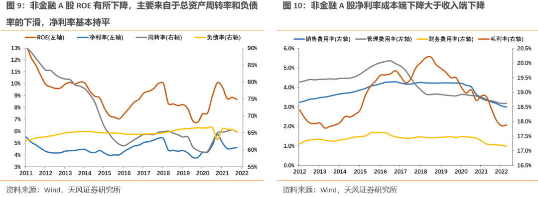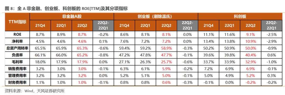 (1)22Q2非金融A股的ROE(TTM)8.7%,较22Q1下降了0.2个百分点,主要由于总资产周转率、负债率的下降,净利率变化不大。