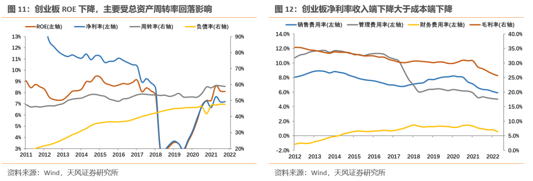 2.创业板(剔除温氏)ROE(TTM)回落至8.1%,较22Q1下降了0.04个百分点,总资产周转率的下滑是拖累ROE的主要原因,净利率、负债率变化不大。