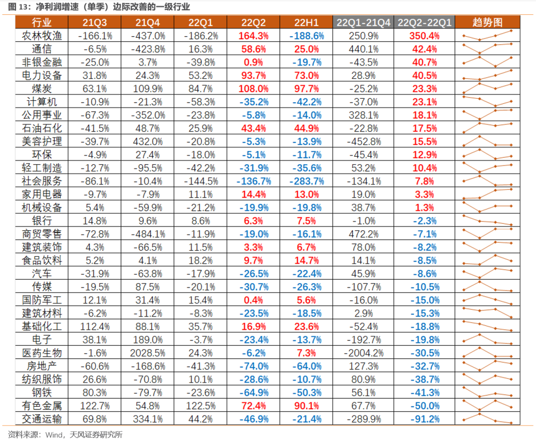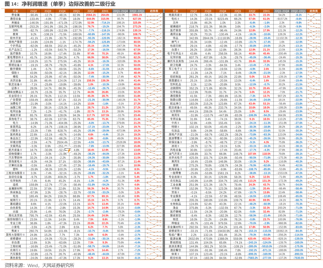 景气边际改善:贵金属、通信设备、养殖业、互联网电商、饲料等行业的净利润增速改善较大,22Q2-22Q1均保持在100%以上。