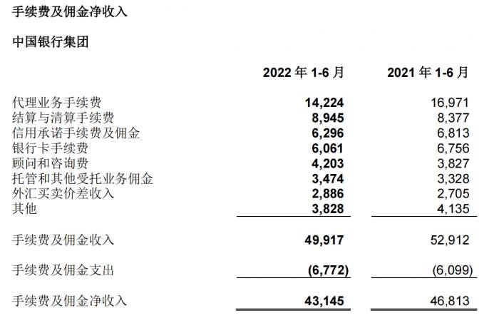 在手续费和佣金净收入方面,集团总计实现收入431.45亿元,同比减少36.68亿元,下降7.84%,在营业收入中的占比为13.77%。中国银行表示,原因主要是受国内外资本市场波动影响,股票买卖佣金收入、基金代销收入下降等。