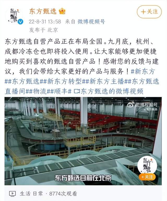 目前,东方甄选已经在北京、广州、郑州等城市建立了7个自营产品仓库,预计到9月底,杭州和成都的冷冻仓也即将投入使用。