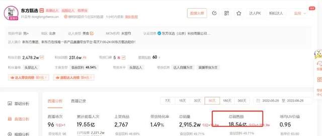 有关数据显示,东方甄选账号直播间近3个月的GMV为18.54亿元,而同期交个朋友GMV只有9.89亿,东方甄选后来居上。