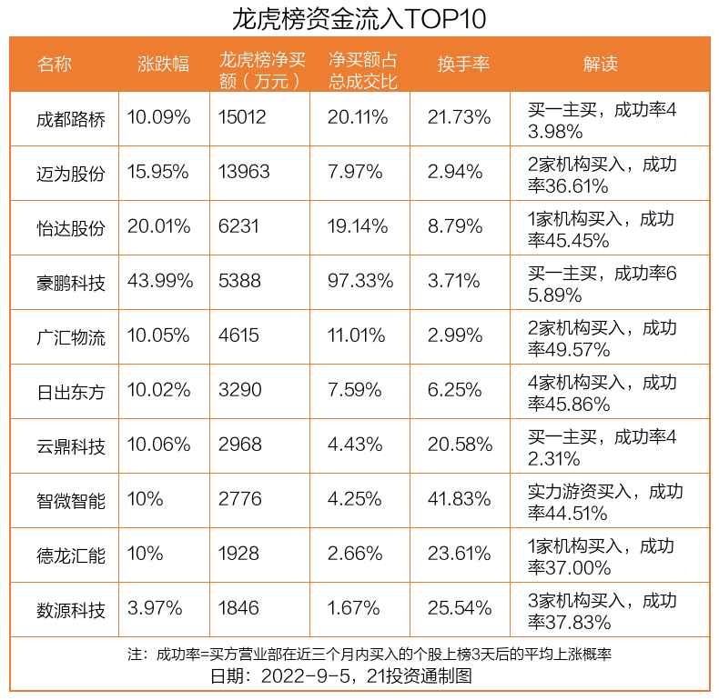 9月5日,上证指数上涨0.42%,深证成指下跌0.2%,创业板指上涨0.2%。盘后龙虎榜数据显示,共有37只个股因当日异动登上龙虎榜,资金净流入最多的是成都路桥(002628.SZ),达1.5亿元。