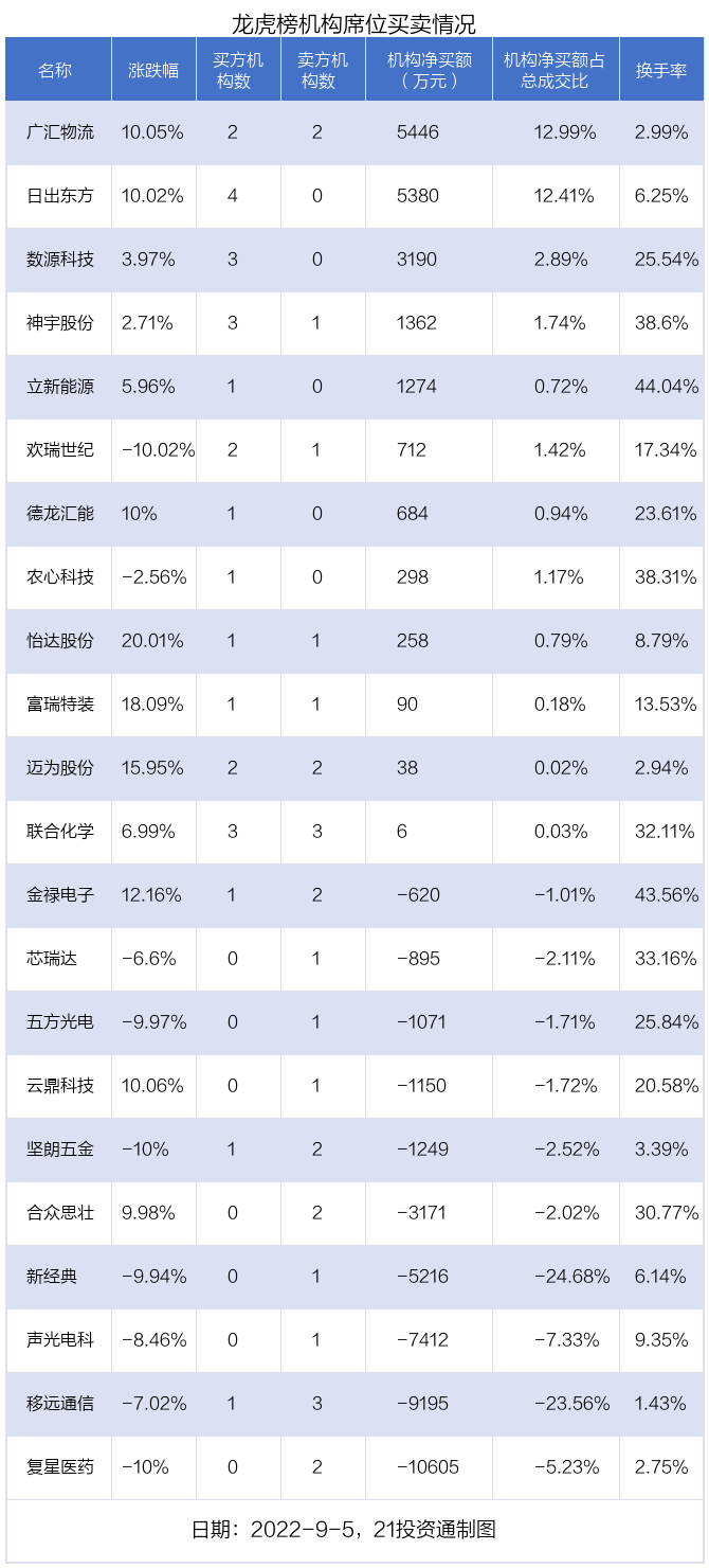 9月5日,22只个股龙虎榜出现了机构的身影,机构合计净卖出2.18亿元。具体来看,机构净买入12股,净卖出10股。