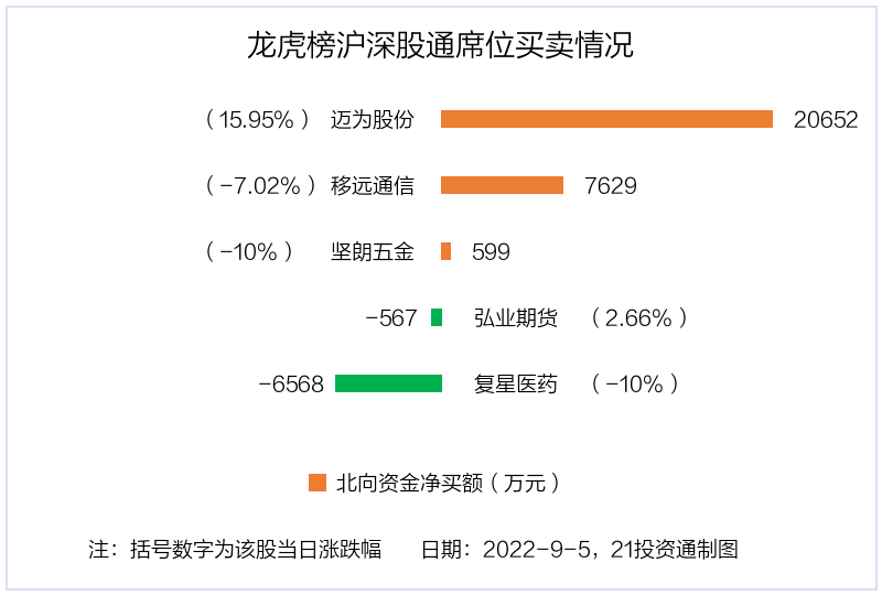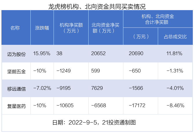 值得注意的是,机构和北向资金共同净买入了迈为股份;共同净卖出了复星医药;在移远通信,坚朗五金上出现分歧,机构净卖出移远通信9195.28万元,北向资金净买入7629.02万元;机构净卖出坚朗五金1249.14万元,北向资金净买入599.48万元。
