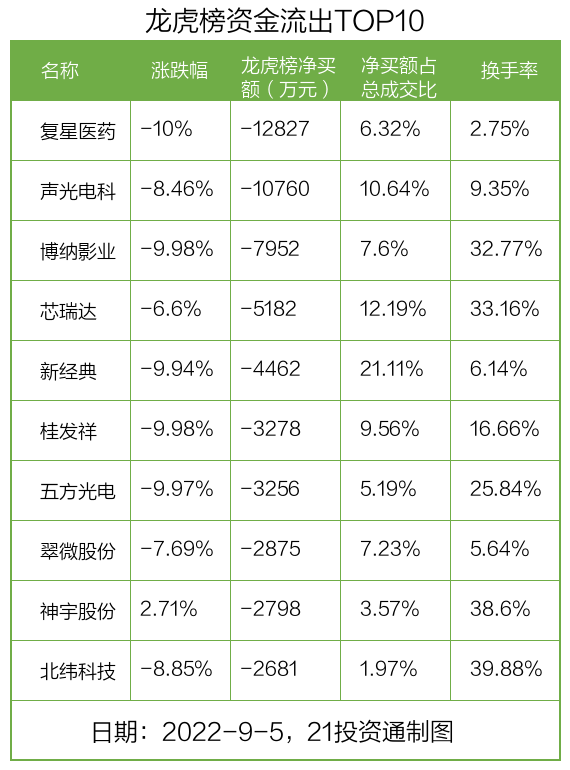 而龙虎榜中资金净流出最多的是复星医药(600196.SH),被净卖出为1.28亿元,占总成交金额的6.32%。复星医药收盘下跌10%,换手率为2.75%。