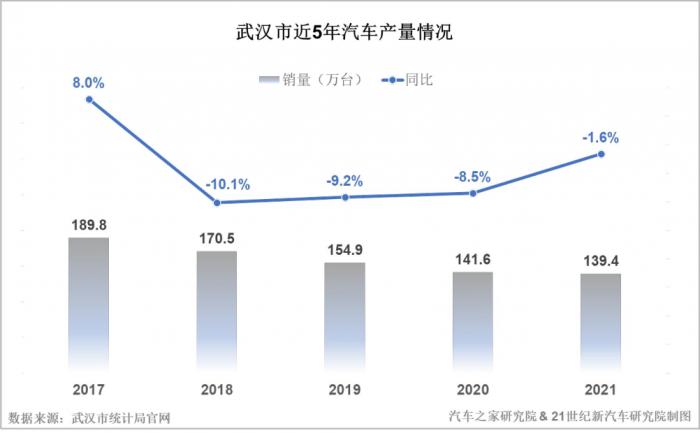 近几年,武汉的汽车产业发展略显落寞,汽车产量已经连续4年下滑。根据武汉市统计局的数据,2021年,武汉市汽车产量仅为139.35万辆,较巅峰时期的2017年减少了约50万辆。
