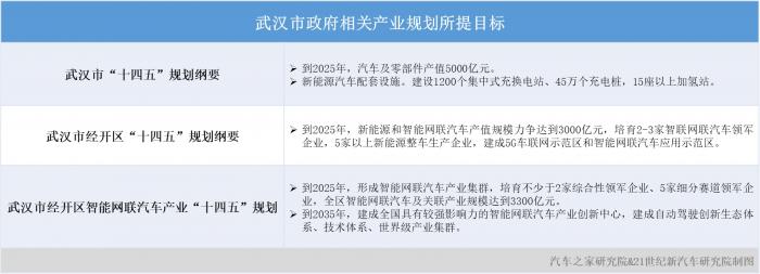 武汉市“十四五”规划纲要中提到,聚焦新能源和智能网联汽车,推动传统汽车转型提升,大力发展汽车研发设计和汽车后市场,加快新能源和智能网联汽车整车产业化,积极创建燃料电池汽车示范城市、国家车联网先导区。到2025年,汽车及零部件产值5000亿元。