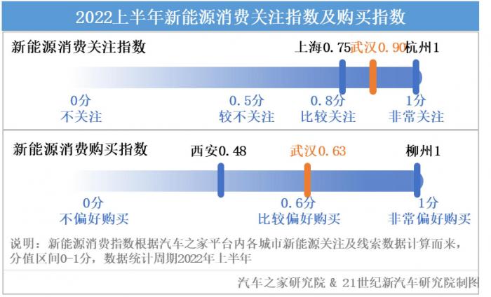 根据汽车之家平台内各城市新能源关注数据计算,武汉市新能源汽车关注指数为0.9,消费购买热情在全国范围来看较高。
