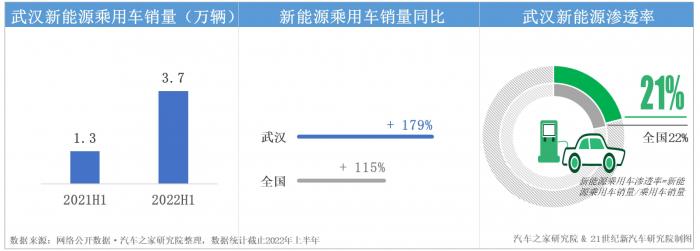 今年上半年,武汉市新能源乘用车的销量为3.7万辆,增长179%,高于全国115%的整体增速,而新能源新车销售渗透率为21%,与全国平均水平相当。