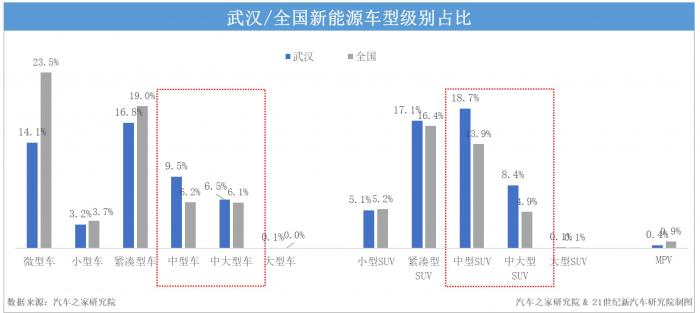 此外,相比轿车,武汉新能源用户更加偏好SUV,新能源SUV的销量占比达49%,明显高于全国水平。分级别来看,武汉市新能源汽车消费者对空间的需求较高,更倾向于选择“大车”。中级及以上新能源车型销量占比均高于全国。
