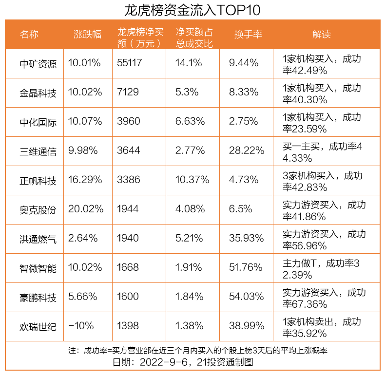 9月6日,上证指数上涨1.36%,深证成指上涨1.04%,创业板指上涨0.1%。盘后龙虎榜数据显示,共有31只个股因当日异动登上龙虎榜,资金净流入最多的是中矿资源(002738.SZ),达5.51亿元。