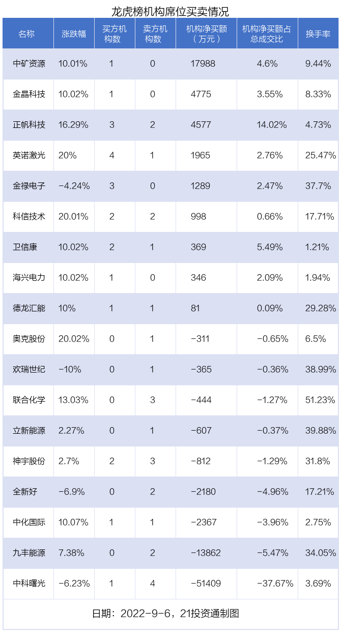 其中,机构净买入金额最多的是中矿资源(002738.SZ),当日收盘上涨10.01%,换手率为9.44%。