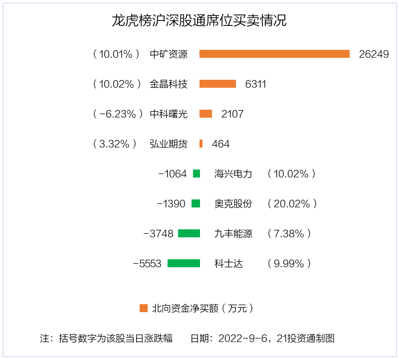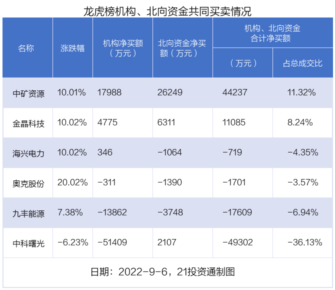 值得注意的是,机构和北向资金共同净买入了中矿资源、金晶科技等2股;共同净卖出了奥克股份、九丰能源等2股;在中科曙光,海兴电力上出现分歧,机构净卖出中科曙光5.14亿元,北向资金净买入2107.05万元;机构净买入海兴电力345.76万元,北向资金净卖出1064.39万元。