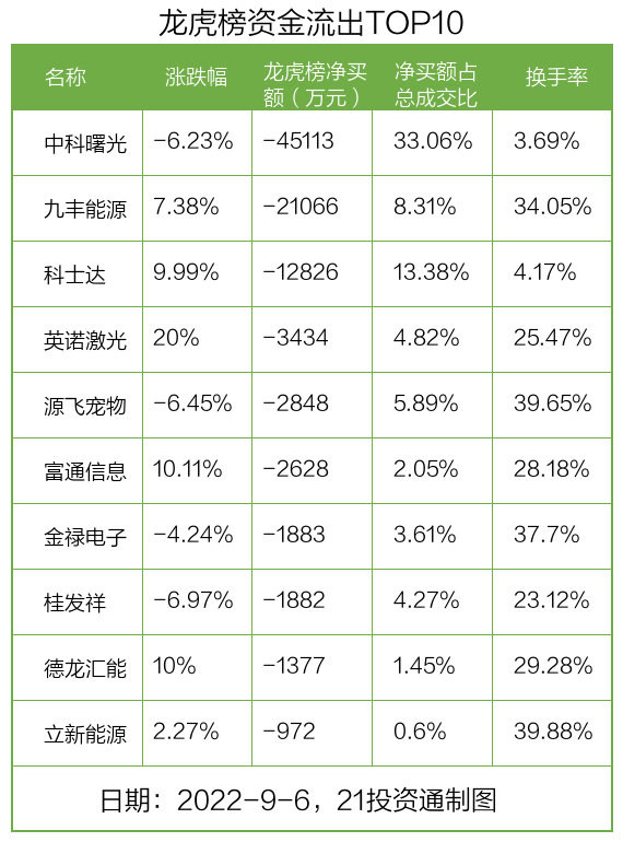 而龙虎榜中资金净流出最多的是中科曙光(603019.SH),被净卖出为4.51亿元,占总成交金额的33.06%。中科曙光收盘下跌6.23%,换手率为3.69%。
