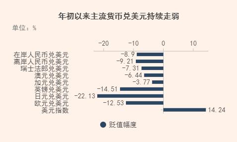 在G7货币中,今年以来日元兑美元贬值22.14%,英镑兑美元贬值14.51%,欧元兑美元贬值12.53%,贬值幅度均大于人民币,这意味着人民币相对英镑、欧元等货币还是升值的。