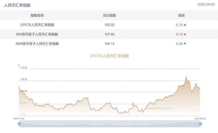 中国外汇交易中心9月5日公布数据显示,9月2日当周三大人民币汇率指数两涨一跌。截至9月2日,CFETS人民币汇率指数报102.02,按周涨0.1;BIS货币篮子人民币汇率指数报107.40,按周涨0.13;SDR货币篮子人民币汇率指数报100.13,按周跌0.24。从历史走势来看,三大人民币汇率指数自7月中旬以来虽小幅回落,但目前仍然处于历史高位区间。