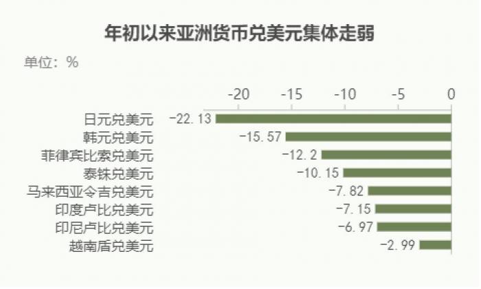 在主流亚洲货币中,韩元兑美元贬值了15.57%,菲律宾比索兑美元贬值了12.2%,泰铢兑美元贬值了10.15%,这意味着人民币相对这些国家的货币也是升值的。