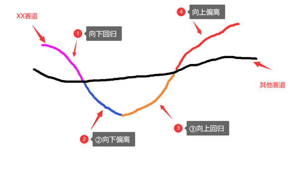再次,根据偏离趋势不同,分为“向下回归”、“向下偏离”、“向上回归”、“向上偏离”4种情况。如下图所示: