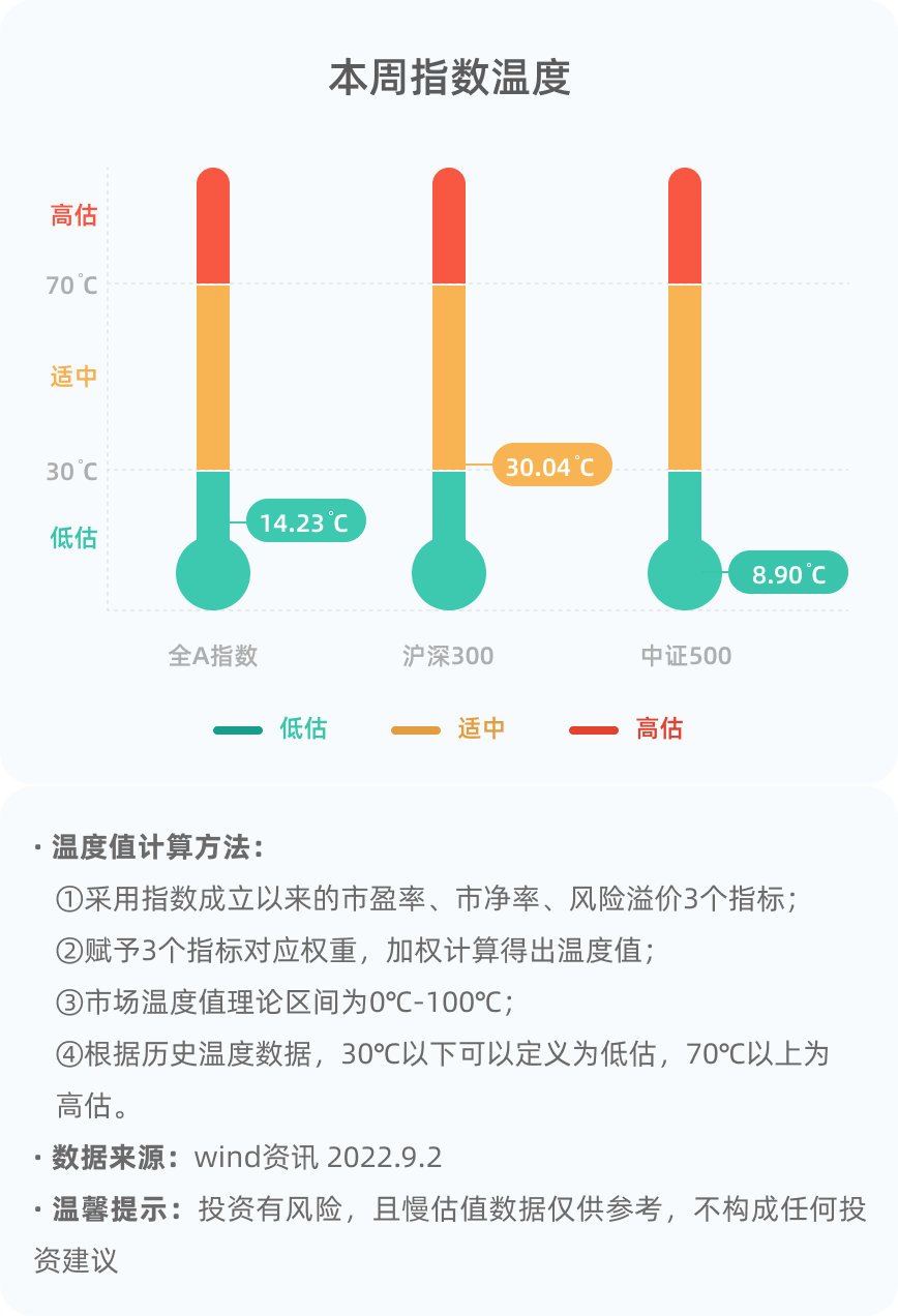 全A指数当前14.23℃,沪深300当前30.04℃,中证500当前8.90℃。整体都处于低估、合理区间。