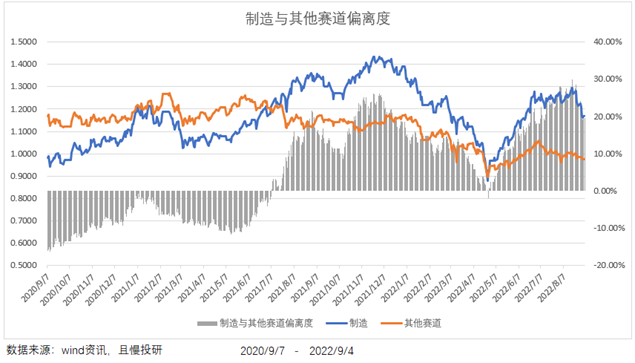 制造赛道当前与其他赛道偏离度在历史93.5%分位,整体趋势为向下回归。