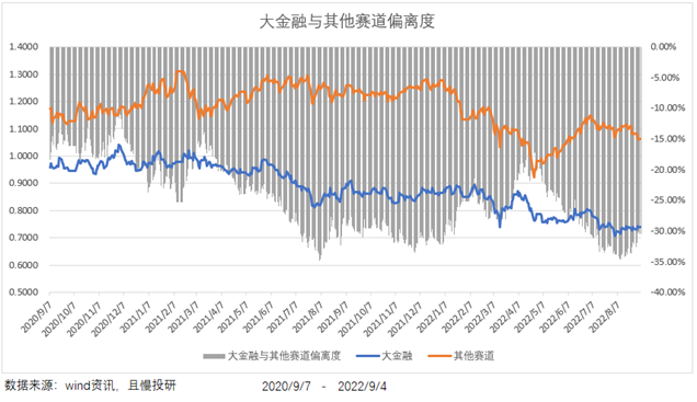大金融赛道与其他赛道偏离度在历史8.9%分位,整体趋势为向上回归。