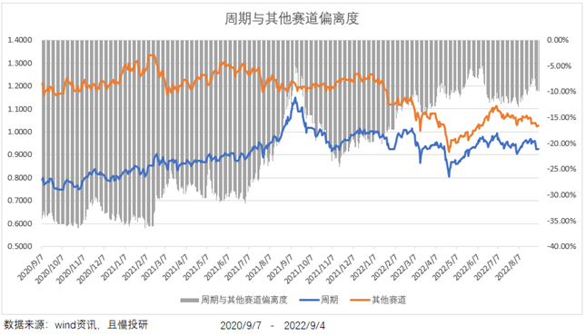 这2年在市场普遍下行的趋势下,周期赛道走出了相对独立的上涨行情,与其他赛道的偏离度从2年前的10%左右分位,逐渐向上回归到当前的76.5%分位。