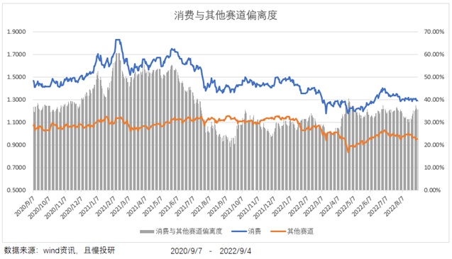这里说一下消费赛道与其他赛道近几年基本都是向上偏离的态势(未出现向下偏离或向上回归)。2021年初消费赛道出现调整的时候,也只是向下回归到50%左右分位。今年7月初市场整体出现调整,消费赛道也处于调整状态。只是相较于其他赛道,消费赛道更抗跌,所以,进一步增大了偏离度。