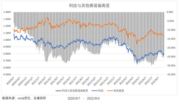 与医药赛道相同的是,科技赛道近2年也处于持续向下偏离的趋势;但不同的是,医药赛道处于向下回归趋势,科技赛道是向下偏离趋势。且当前偏离度已接近历史极值区间。从历史经验来看,当偏离度处于历史极值区间的时候,往往更有可能发生风格切换。